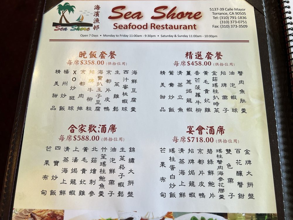 Seashore Chinese Restaurant in Torrance, CA offers a range of traditional Chinese dishes with options for vegans and vegetarians. The menu includes appetizers like Egg Rolls and Fried Shrimp, as well as soups like Fish Maw Soup with Crab Meat and Abalone with Chicken Soup. Customers rave about the Peking duck, ribs, and Hainan chicken. The decor may be faded, but the food remains consistently delicious. Service can be hit or miss, but the servers are professional and dishes are served promptly. Highlights include the pork spare ribs, seafood fried noodle, and seafood tofu. Overall, Seashore Chinese Restaurant is a longstanding favorite in the area, known for its tasty dishes and friendly staff.