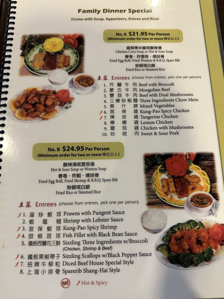 $21.95 per person. Chicken corn soup or hot and sour soup, salad, fried egg roll, fried wonton and BBQ spare rib, fried rice or steamed rice. Includes soup, appetizer, entree and rice. Minimum order for 2 or more.